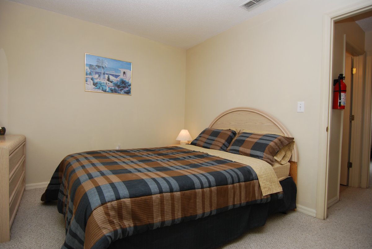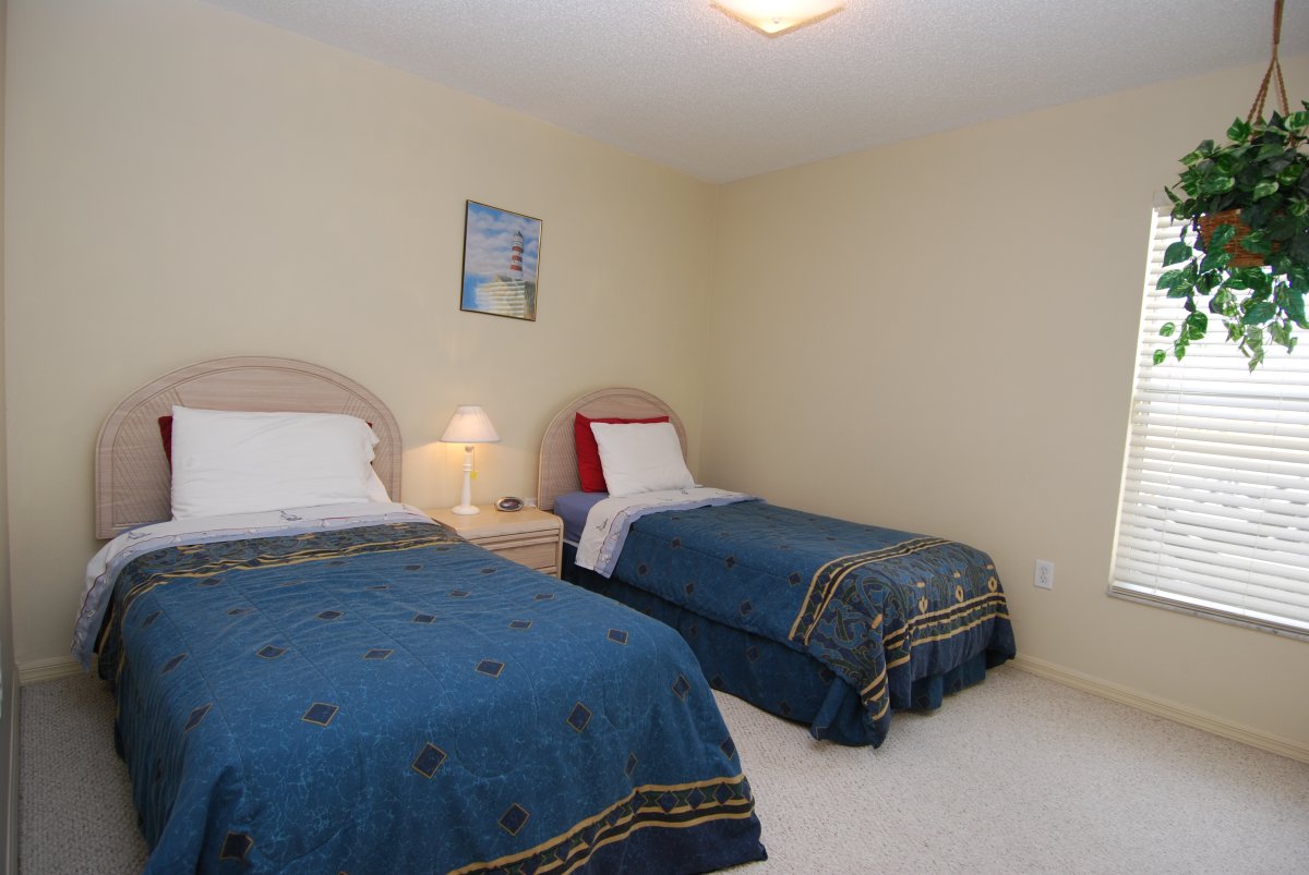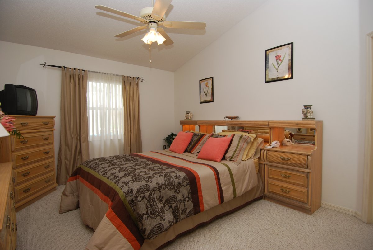 | Double Bedroom - a spacious room overlooks the patio area at the back of the villa. Sleep soundly in the comfortable queen size bed. There is a chest of drawers and also a large closet for storage. | Master Bedroom - contains a queen size bed and overlooks the jacuzzi from the bedroom window. Also has a large walk in closet for you to hang your clothes and plenty of drawer space. Walk through into the large en-suite bathroom that has separate shower and twin sinks. Enjoy a relaxing bath in the oversized oval tub. TV to relax in bed | Twin Bedroom - great for accommodating either children or adults in a comfortable room overlooking the front of the villa. Storage space provided by a large closet with hanging rails. |